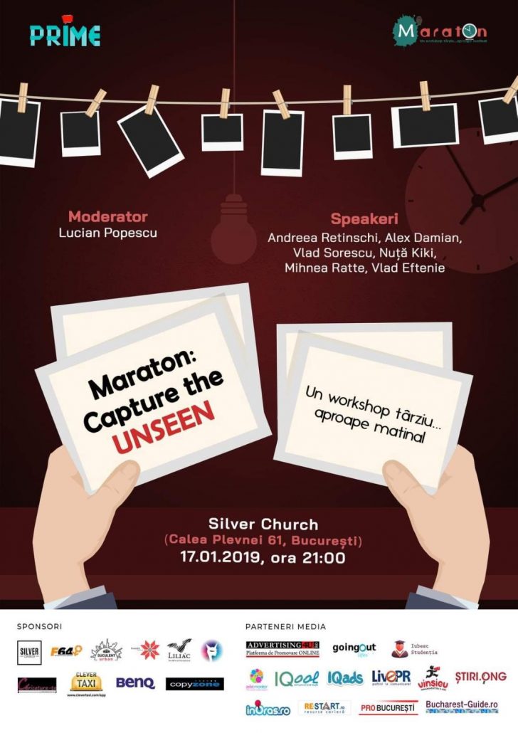 Anul acesta, PRIME România vă invită la cea de-a X-a ediție a unui workshop târziu…aproape matinal, PRIME Maraton: Capture the unseen. Evenimentul va avea loc joi, 17 ianuarie 2019, la Silver Church (Calea Plevnei 61), de la ora 21:00. La ediția curentă, pe parcursul întregii nopți, participanții sunt invitați să descopere fotografia, dincolo de imagine și branding personal.